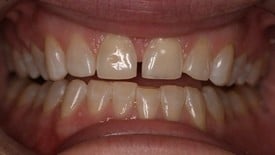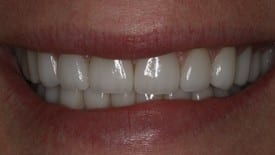 This patient wanted to lighten her teeth, close the space between her front teeth and noticed that her front teeth were being worn flat. Dr. Von Tersch designed and delivered porcelain veneers on all of her top and bottom teeth and crowns on her back teeth to help support her bite. Dr. Von Tersch also made her a night guard to protect her new smile from future damage.